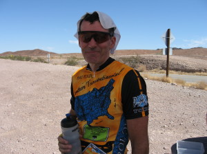 Me with a wash cloth soaked in ice water on head. Man does that feel good. Taken at a SAG stop (at 63-miles) |