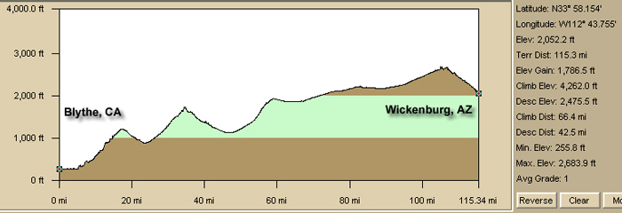 Gentle steady climbing, then a nice shallow descent into Wickenburg AZ |