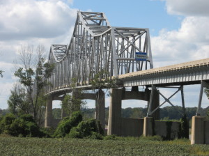 Crossing the Mississippi River from Arkansas to Mississippi. Once again we were denied a state welcome sign. Our "Welcome to Mississippi" was nowhere to be found on the Route 49 bridge. Maybe we're not welcome here either. |
