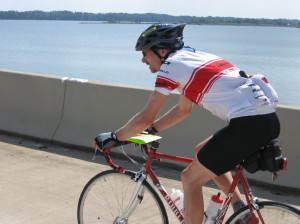 Eamonn riding over the Alabama River (at 93 miles). There is a dam downstream so this backed-up section is called the Dannelly reservoir. |