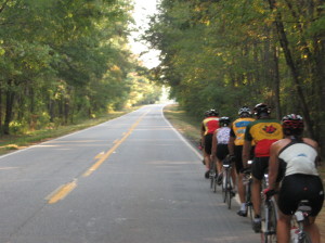 Pace line at 25 miles on a lovely tree-lined roadway (just before the first SAG) |