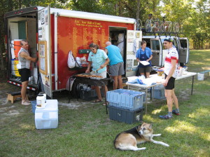 Lunch in Blackville GA (at 74 miles). Denis getting a drink at the back of the trailer; Susan at the grill with Steve S and Lara helping; Bisti the dog well behaved as usual; and Eamonn first in the food line shouting "Service please!" |