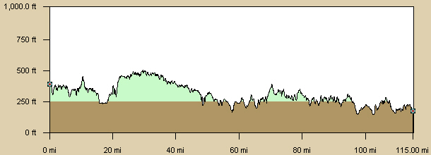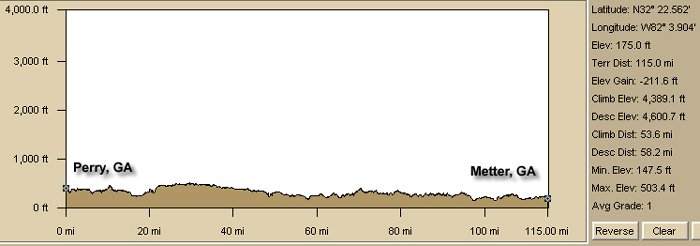 We hammered to the last SAG stop at 98 miles (just 16 miles from the finish). Leaving that SAG stop the route sheet said to continue going straight (north), so we did. Unfortunately, the way to our hotel was a right turn (east). In addition, it was 14 miles to the next turn on a road with a lot of road construction so when the intermediate waypoints on the route sheet didn't appear it was plausible that the construction was the cause. After about 8 miles, I started having suspicions. A few miles later in Swainsboro, I told the others that we must be off track. We asked several motorists for directions to Metter finally taking Lambs Bridge Rd to Rt 23 south back to Metter.