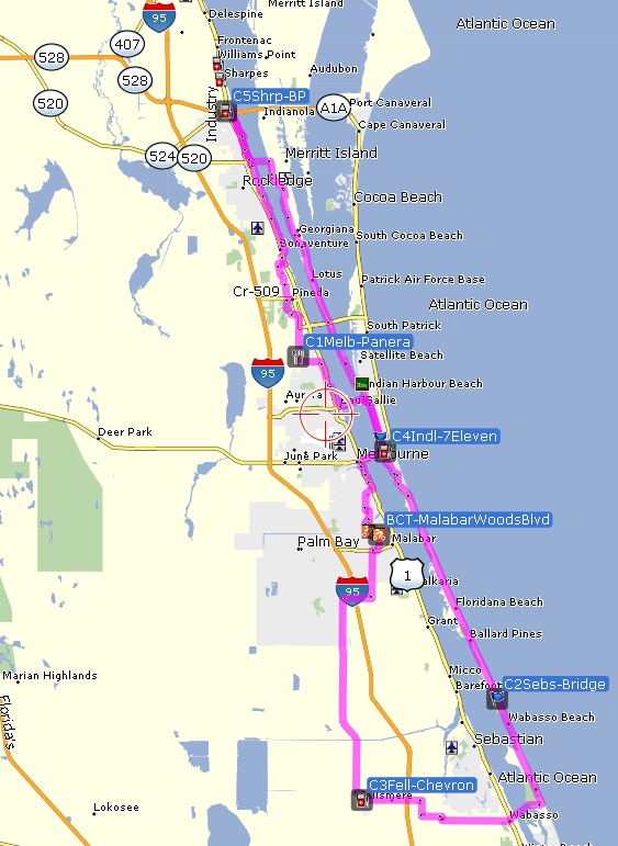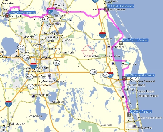 Start Location for all rides (except "Mt Dora to Melbourne") is Panera Bread in the Post Commons Shopping Center, Wickham and Post Rd., Melbourne, FL; Open Hours are 6:30 AM to 9:30 PM Monday thru Saturday. The "Mt Dora to Melbourne" ride ends at this Panera Bread restaurant.