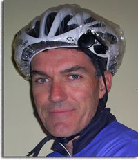 Sporting my $0.25 helmet cover (my wife's shower cap) |
