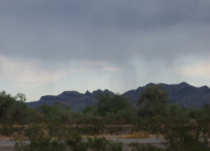 I can't decide which is worse: lightening, rain, or strong headwinds. Oh well, I guess it doesn't matter since at the start today we had all three. At our outdoor breakfast an ominous looking storm brewed with lightening illuminating the pre-dawn sky to our east - the direction we would be heading. It started to rain shortly after mounting my bike and winds whipped up to a stiff 20+ mph in our face. Fortunately though, we didn't get too wet as much of the rain evaporates before hitting the ground here in the desert (as the photo below illustrates).