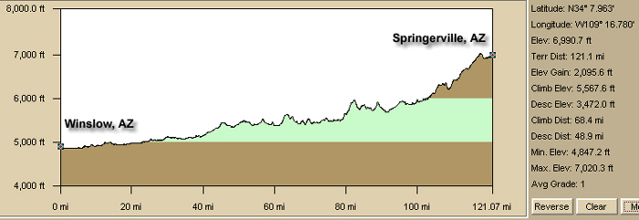 At Saint Johns we turned more directly into the wind while climbing a net elevation gain of 1400 ft in the last 30 miles. |