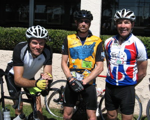 The 50°F start required a little more than the light jacket I wore, so I set a fast tempo from the start to warm up. I passed about ten riders and was clear of the field at 4 miles. A few miles later I was happy to see Eamonn join me and the two of us set a nice 22 mph tempo in calm winds, alternating the pace setting every time we passed a milepost. We were first to the first SAG and while there we were joined by another strong rider, Dennis from Anchorage Alaska.