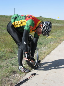 Dan changing his flat. This was the second flat that I stopped to help fix today. Of course, I'm not helping very much at this moment. |