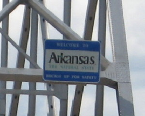 In Mississippi looking back to Arkansas. | Closeup of the left photo. At least we found our "Welcome to Arkansas" sign. It was here the whole time, on the other side of the state! |