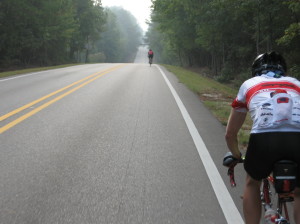 After lunch we had just got up to speed when Eamonn had a flat tire that set us back another 8 minutes and again several groups passed us by. We pushed near our limit on every hill, upshifting on the crest and powering down the backside get clear of the field once again. At 30 miles to go Randy got around us and went on to be the first in today with Eamonn and I second. Patick was the next rider in.