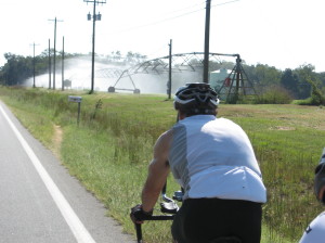 Walter and Denis near Allentown GA (at 37 miles) | Denis with farm sprinklers just before the second SAG stop near Dudley GA (at 45 miles) |